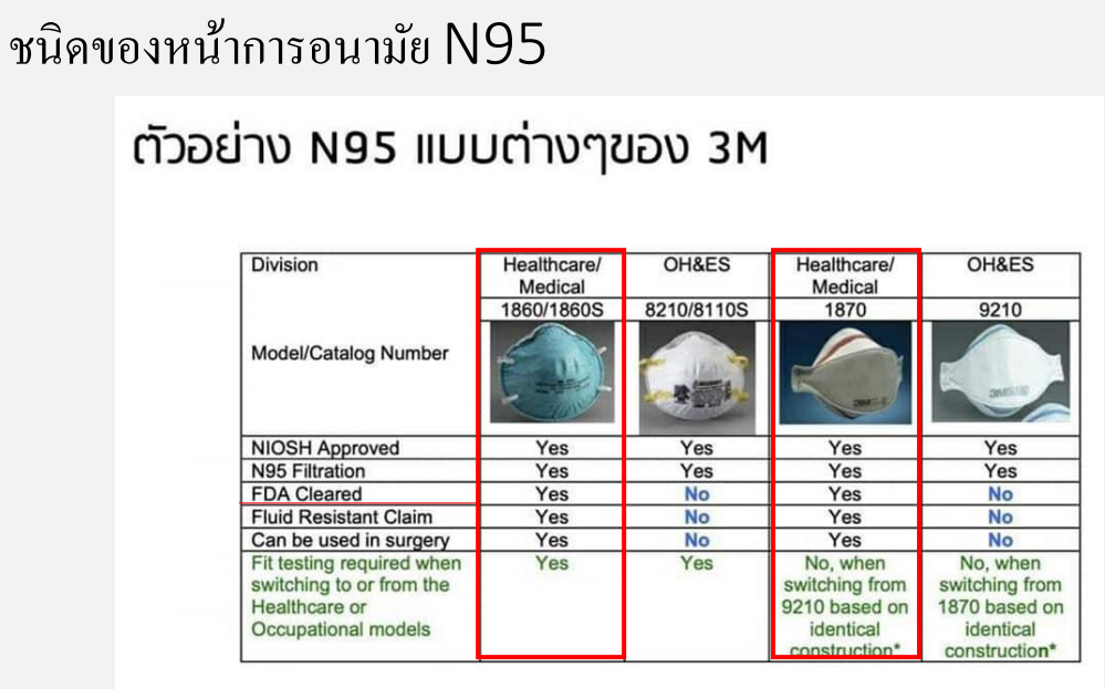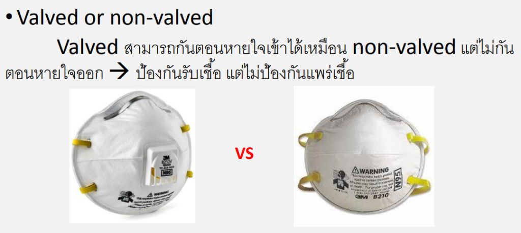 - ต้อง ตรวจสอบความพอดี (Fit Test) โดยเฉพาะในกรณีใช้ N95 หรือหน้ากากครึ่งหน้า